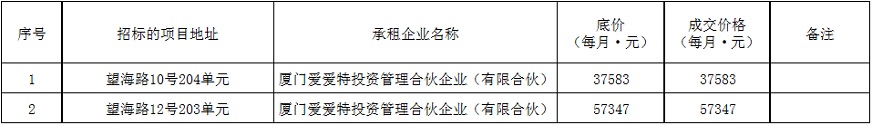 根據(jù)思明區(qū)國有企業(yè)資產(chǎn)出租管理的相關(guān)制度,我司2019年5月10日上午9:00起于觀音山營運中心2號樓2層2號會議室進行公開招租現(xiàn)場開標,現(xiàn)通過思明控股網(wǎng)站對外發(fā)布成交公告,內(nèi)容如下: