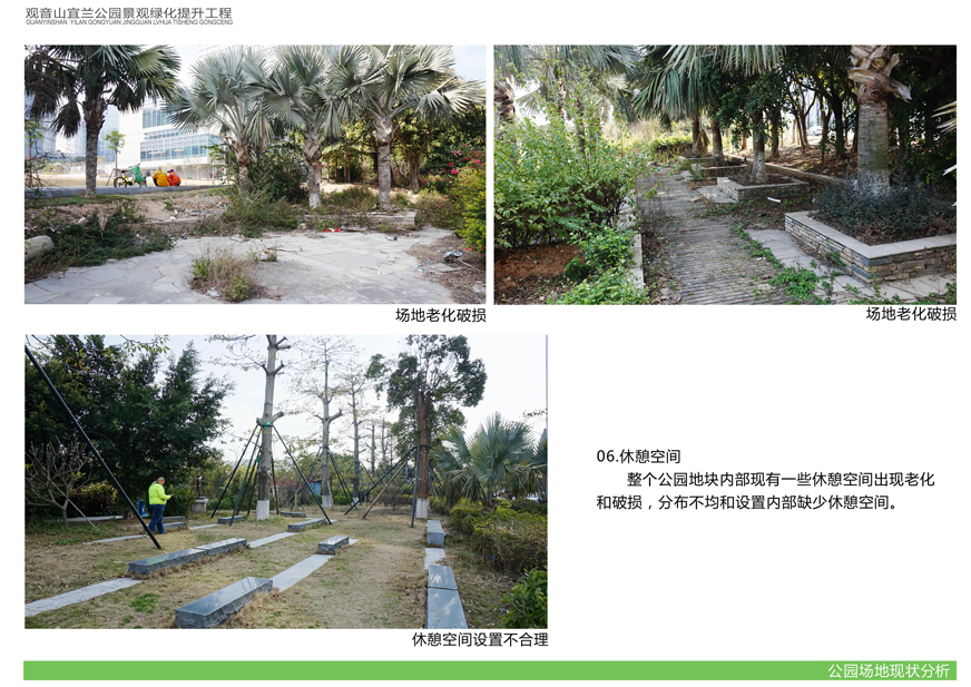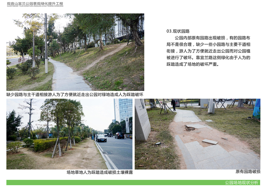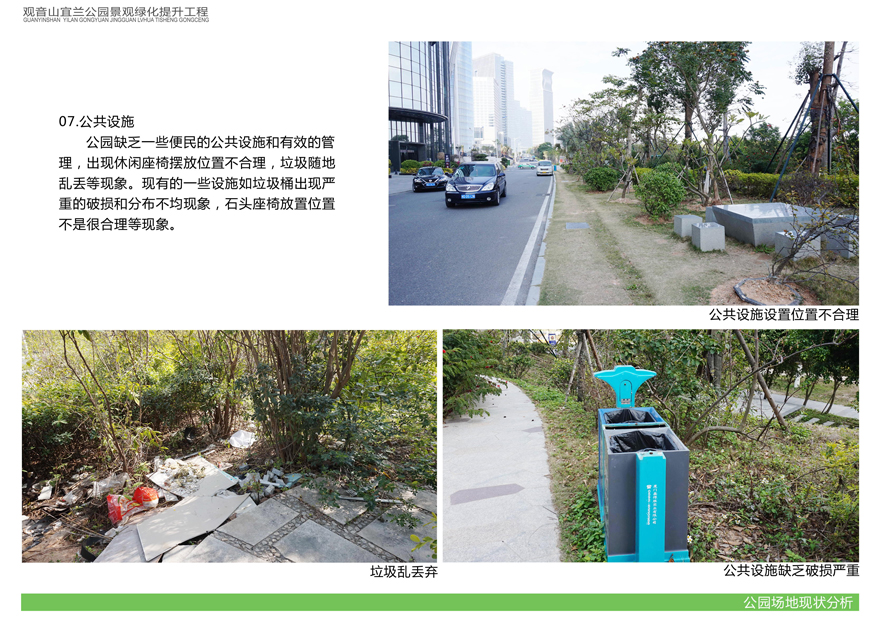 項目位于環(huán)島東路與觀音山商務(wù)營運中心之間,緊鄰城市干道環(huán)島東路及市政道路宜蘭路。該區(qū)域景觀綠化目前存在植被缺少后期養(yǎng)護,雜草較多,并出現(xiàn)倒伏現(xiàn)象,影響人行交通;各類設(shè)施老化,景觀帶內(nèi)垃圾無人清除,造成環(huán)境污染;區(qū)域兩側(cè)靠近車行道,缺少必要的人行園路,安全性較差;配套設(shè)施不完善,澆灌系統(tǒng)布局不合理等問題,嚴重影響城市形象,因此對現(xiàn)狀綠化進行整治十分必要。