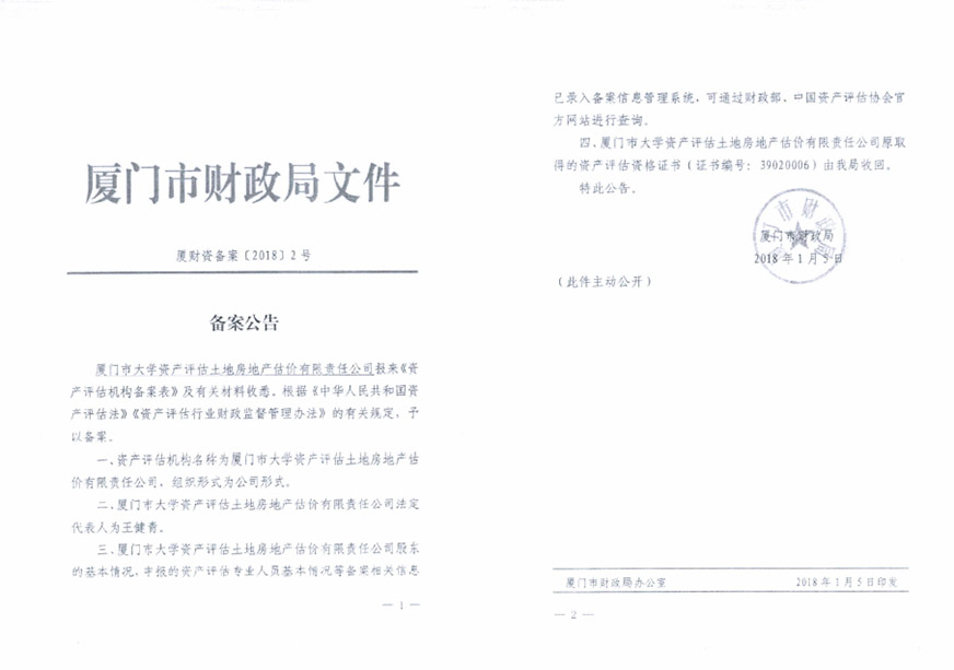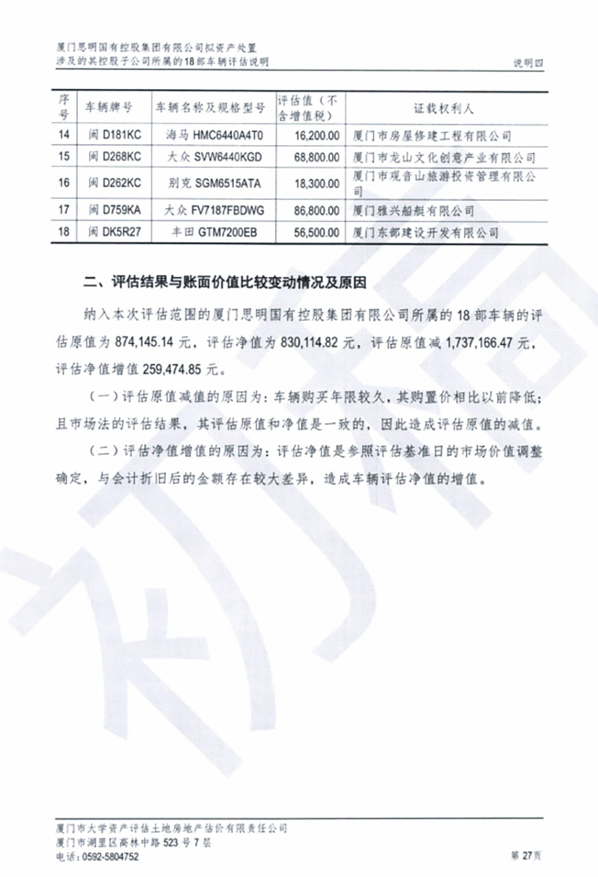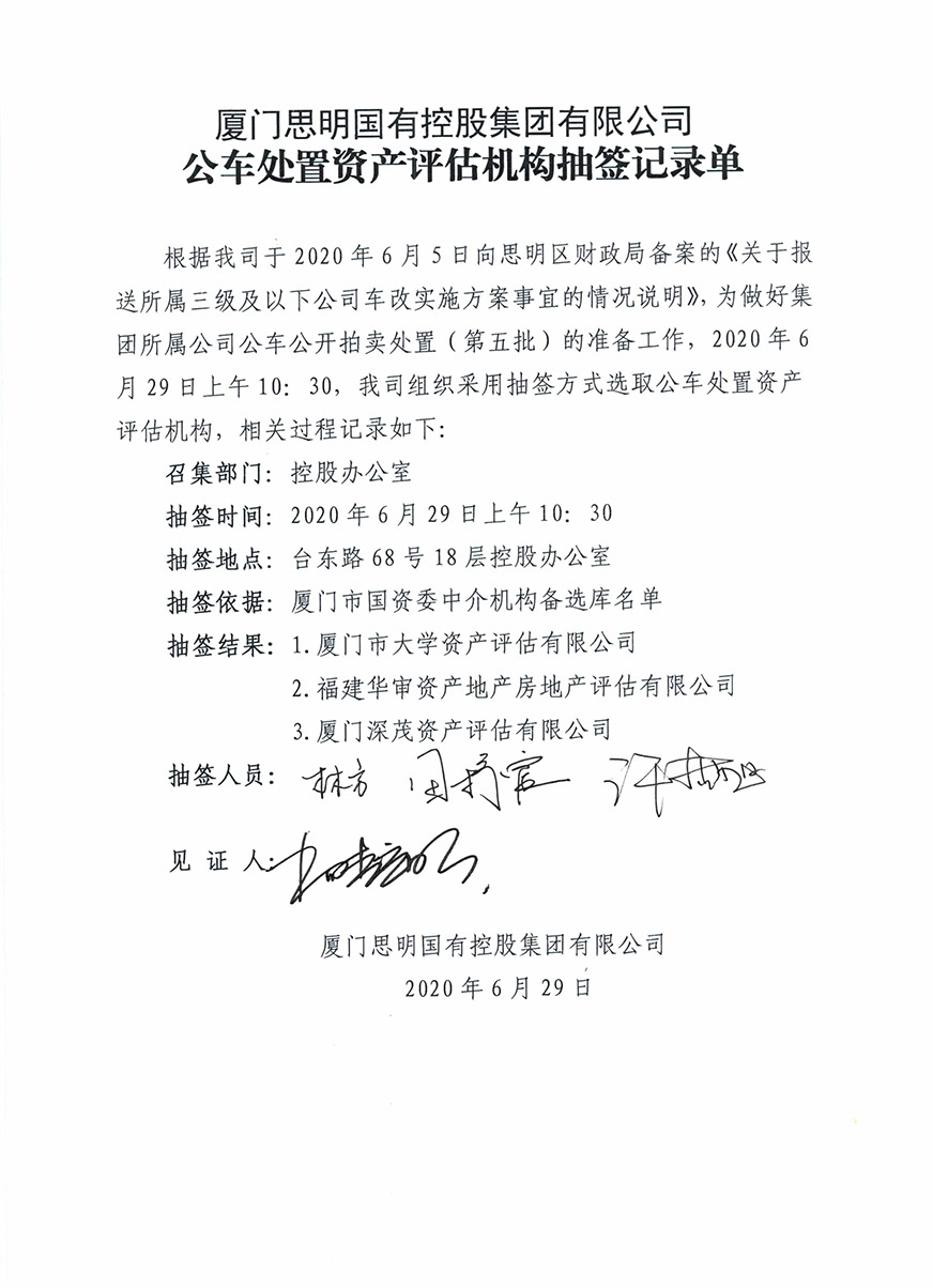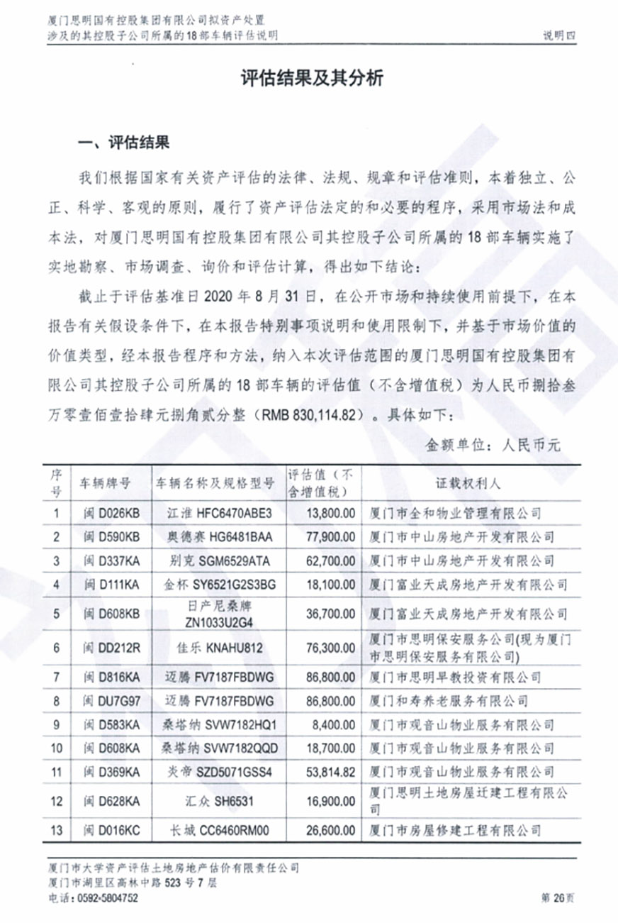根據(jù)2020年6月5日我司報經(jīng)思明區(qū)財政局批準備案的《關于報送所屬三級及以下公司車改實施方案事宜的情況說明》相關文件精神,我司委托廈門市大學資產(chǎn)評估土地房地產(chǎn)估價有限責任公司對公車處置(第五批)的車輛進行評估,該公司已于9月30日向我司提交資產(chǎn)評估結(jié)果初稿。現(xiàn)將評估結(jié)果進行公示,如有異議,歡迎來電來函反映。
