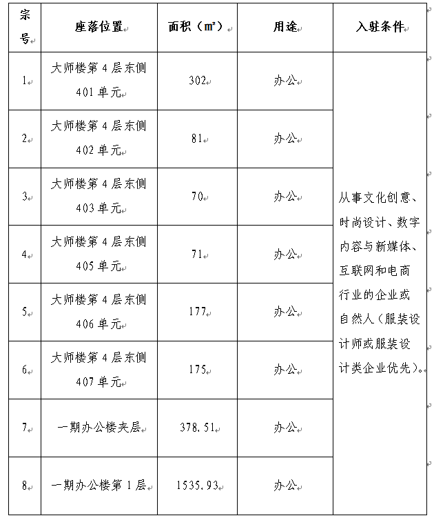 根據(jù)國有企業(yè)資產(chǎn)出租管理相關(guān)制度,我司決定對位于龍昌路12號、誼愛路100號嘉蓮商務(wù)中心下列8宗房產(chǎn)對符合入駐條件的意向承租人進(jìn)行公開競價(jià)招租,具體信息如下: