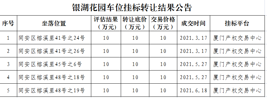 根據(jù)思明區(qū)國有企業(yè)資產(chǎn)管理的相關(guān)制度,我公司在廈門產(chǎn)權(quán)交易中心對銀湖花園5個車位(車位信息詳見下表)進(jìn)行公開資產(chǎn)掛牌轉(zhuǎn)讓。截止2021年6月25日,5個車位全部完成交易?,F(xiàn)通過思明控股網(wǎng)站對外發(fā)布成交公告,內(nèi)容如下: