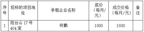 根據(jù)思明區(qū)國有企業(yè)資產(chǎn)出租管理的相關(guān)制度,我司2021年8月9日上午9:00起于觀音山營運(yùn)中心7號樓2層會議室進(jìn)行公開招租現(xiàn)場開標(biāo),現(xiàn)通過思明控股網(wǎng)站對外發(fā)布成交公告,內(nèi)容如下: