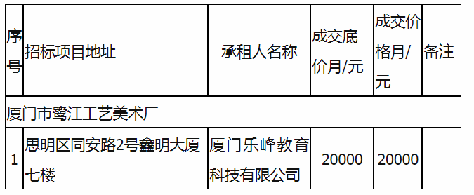 根據(jù)思明區(qū)國有企業(yè)資產(chǎn)出租管理的相關(guān)制度,我司2021年10日上午9:00起于廈門市思明區(qū)觀音山國際商務(wù)營運中心2樓2層2會議室進行公開招標現(xiàn)場開標,現(xiàn)通過思明控股網(wǎng)站對外發(fā)布成交公告,內(nèi)容如下: