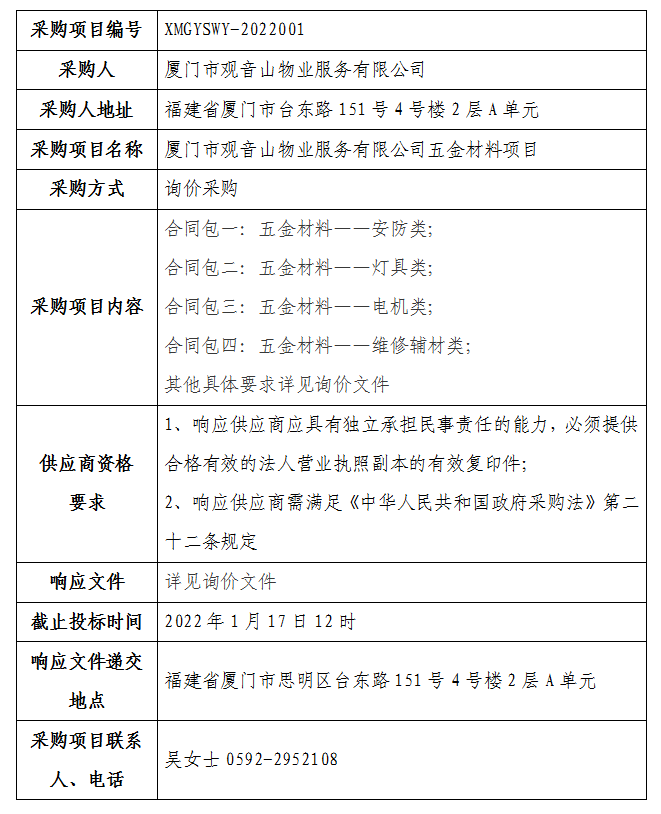 廈門市觀音山物業(yè)服務(wù)有限公司五金材料