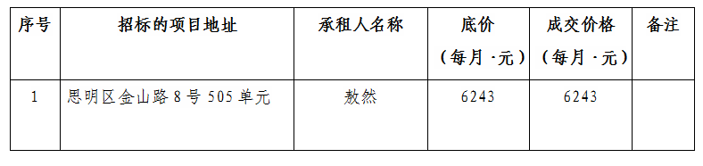 根據(jù)思明區(qū)國有企業(yè)資產(chǎn)出租管理的相關(guān)制度,我司2021年11月28日上午10:00起于廈門市思明區(qū)嶺兜西路623號3樓商管公司會議室進(jìn)行公開招標(biāo)現(xiàn)場開標(biāo),現(xiàn)通過思明控股網(wǎng)站對外發(fā)布成交公告,內(nèi)容如下: