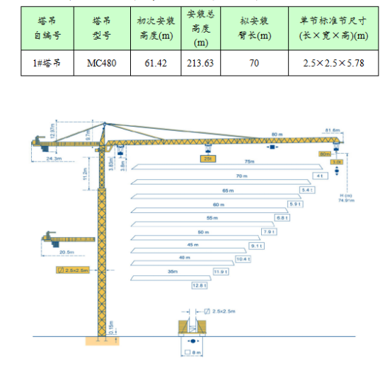答:計(jì)劃8月中旬拆除1#塔吊。端部最大吊裝能力及平面布置圖如下: