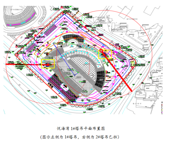 1、請告知現(xiàn)場塔樓施工塔吊的型號、拆除時(shí)間、端部最大吊裝能力及平面布置圖。