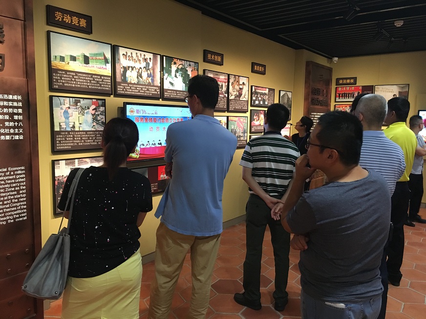 陳列館分為三部分,一樓是廈門工運史展,二樓是改革開放40年廈門工會工作成果展,三樓是羅揚才、楊世寧烈士工作場景復原。全體黨員干部認真傾聽現(xiàn)場工作人員的講解,了解廈門早期產業(yè)工人的誕生、發(fā)展史以及改革開放40年廈門總工會工作成果。