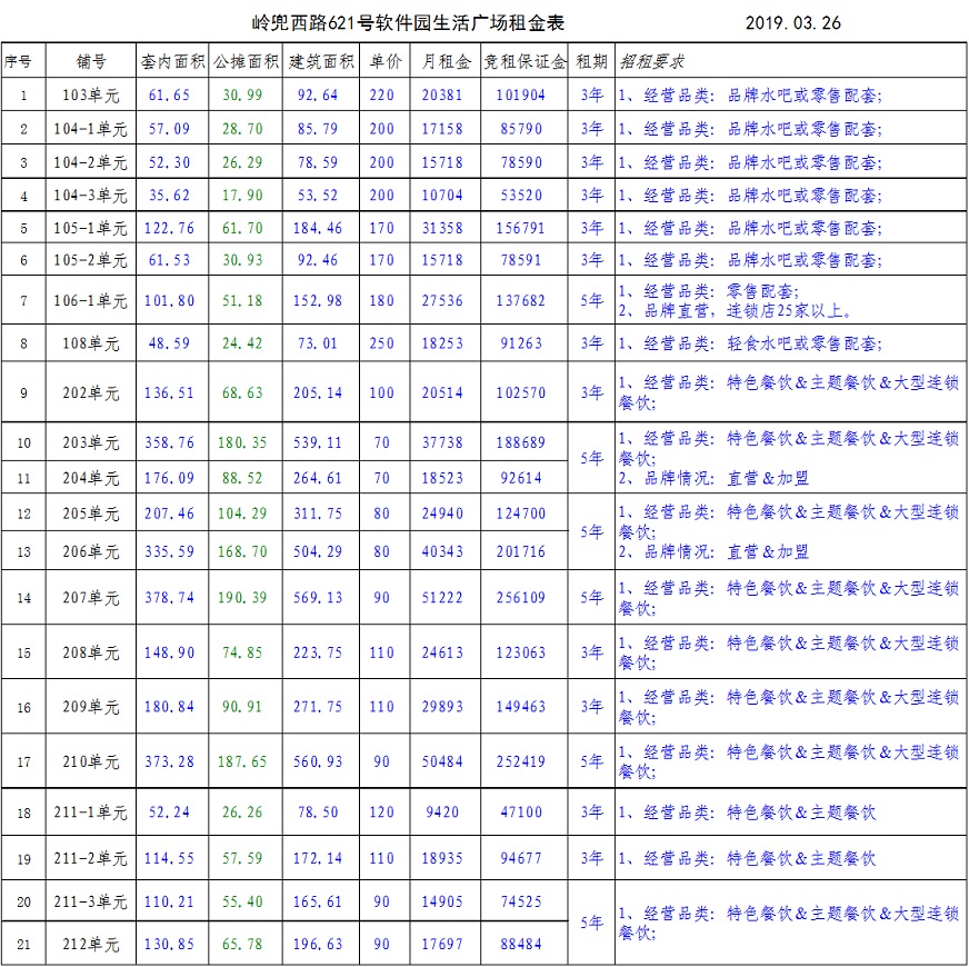 招租要求:詳見附表(軟件園生活廣場公開招租信息表)